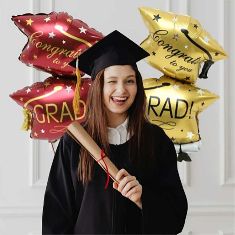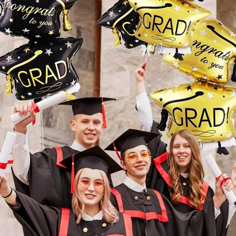 Bu mezuniyet balonu seti, mezuniyetinize gösterişli bir dokunuş katmak için siyah ve altın olmak üzere üç renkte mevcuttur. Altın mezuniyet şapkası balonları ekstra şenlikli bir dokunuş katıyor.