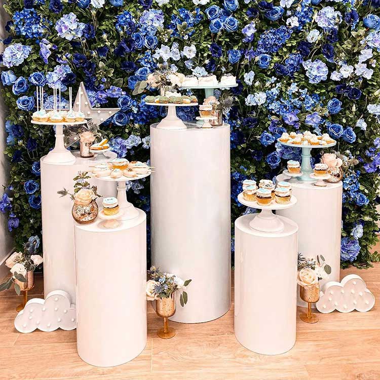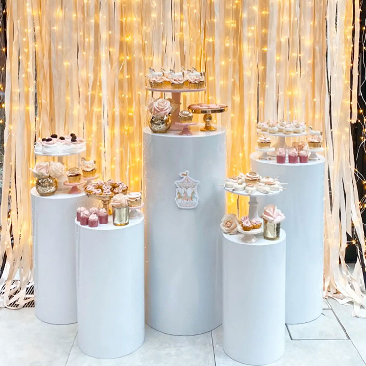 Silindir tabanlı tatlı masası hem kap hem de süs görevi görüyor. Genellikle çeşitli kombinasyonlarda gelirler: 3 parçalı kombinler, 5 parçalı kombinler, 7 parçalı kombinler vb. En yaygın kombinasyon beş parçadır. Çeşitli boyutlarda bağımsız silindirik tüpler esnek bir şekilde düzenlenebilir ve bunlar sahnenin önemli bir parçasıdır. Aynı zamanda boyut ve şekil için özelleştirme de sunuyoruz. Üstelik parti dekorasyonlarınızla da uyum sağlıyor.