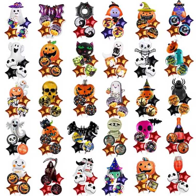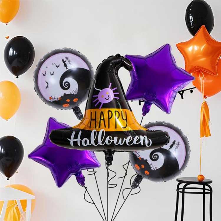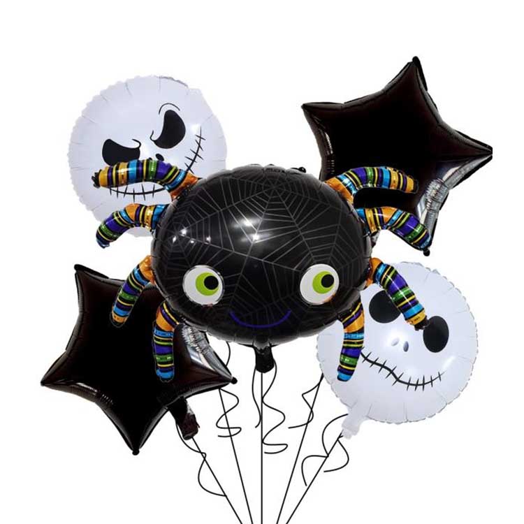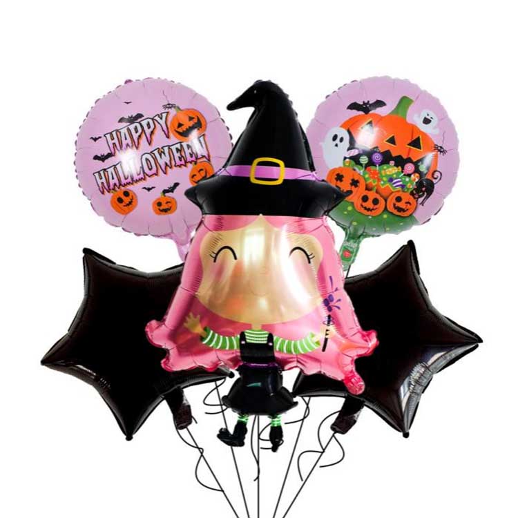 Cadılar Bayramı beş parçalı seti, Cadılar Bayramı için özel olarak tasarlanmış bir balon setidir. Genellikle folyo balonlardan, lateks balonlardan ve diğer aksesuarlardan oluşur. Toplamda beş balon türü içerir! Her sette Cadılar Bayramı temasına mükemmel şekilde uyan bir desen veya karakter bulunur. Cadılar Bayramı dekorasyonları için mükemmel olan balonları helyumla doldurarak yüzmelerini bile sağlayabilirsiniz! Bu, Cadılar Bayramı'nın gizemli atmosferini gerçekten yoğunlaştırıyor!