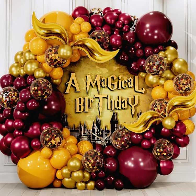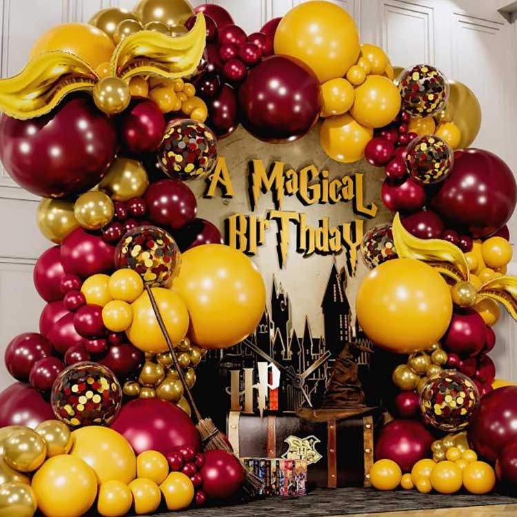 Harry Potter balon çelengi kitinin tasarımı büyük ve güzel bir balon çelengidir; Bu setteki tüm lateks balonlar, belirli bir kalınlık ve elastikiyete sahip ve mükemmel kalitede yüksek kaliteli, saf doğal lateksten yapılmıştır; tipik özellikleri parlak renkler ve yüksek kalitede üremedir, bu da onu sihirbazları seven herkesin oradaymış gibi hissetmesini sağlayan tipik bir özellik haline getirir. Sette standart yuvarlak balonlara ek olarak dekoratif altın boynuz şeklinde folyo balonlar da bulunur. Şişirildikten sonra bunlar tercihinize göre herhangi bir yere yerleştirilebilir.