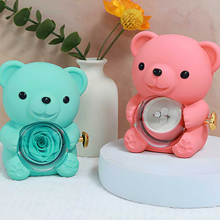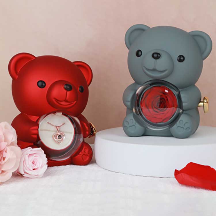 Bu Hug Bear Rose mücevher kutusu bir masa, kitaplık veya komodin üzerinde sergilemek için kullanılır. En dikkat çekici özelliği ise ortasındaki korunmuş gül. Gülün açılması mücevherleri, yüzükleri veya hatıraları saklamak için bir bölmeyi ortaya çıkarır.