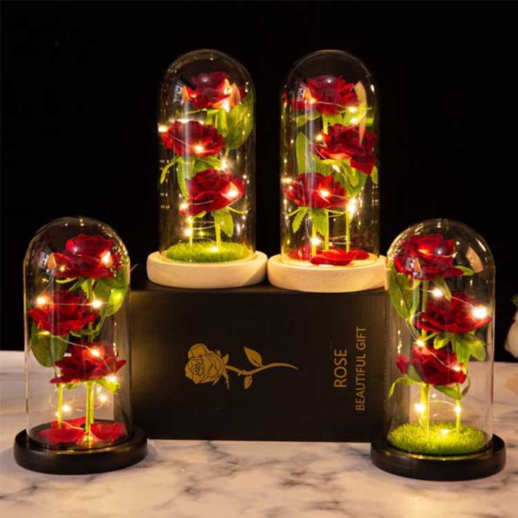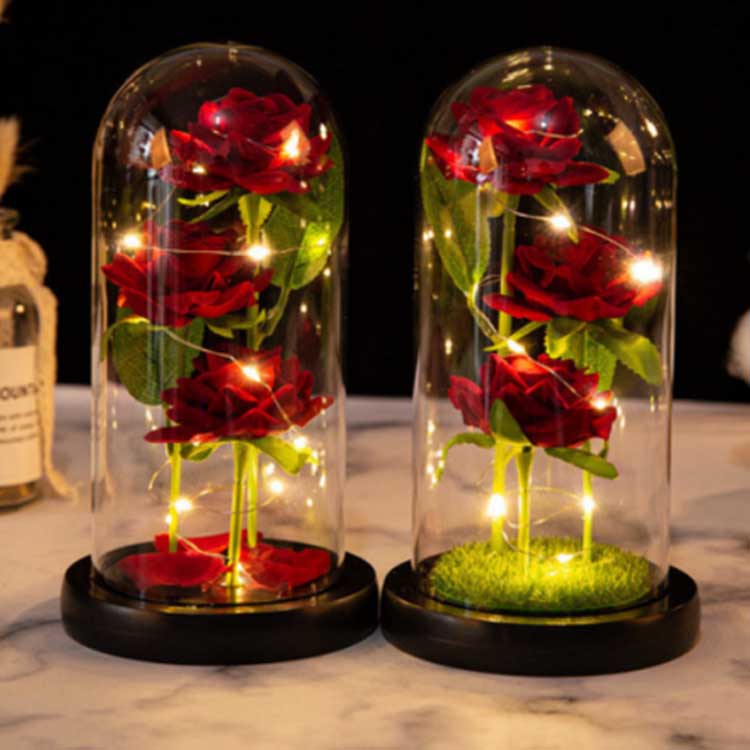 Gül rengi cam kubbenin içinde, gerçekçi saplara ve yeşil yapraklara sahip, farklı yüksekliklerde yerleştirilmiş üç korunmuş çiçek bulunur. Cam kapak ısıya dayanıklıdır ve kolayca zarar görmez. LED şerit ışıklar yerleşik yumuşak aydınlatmaya sahiptir ve anahtar, kolay kullanım için ahşap tabanın altına yerleştirilmiştir. Düğün dekorasyonlarında ve ev mobilyalarında kullanıma uygundur ve ayrıca yıldönümü hediyesi veya doğum günü hediyesi olarak da verilebilir. Set, minimalist bir cam kubbe ve özelleştirilebilir bir hediye kartı içerir.
