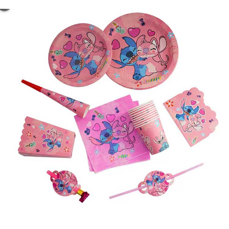 Stitch tek kullanımlık tabak seti şu ürünleri içerir: 7 inçlik tabaklar (10 adet/torba), 9 inçlik tabaklar (10 adet/torba), peçeteler (20 adet/torba), flamalar (10 adet/torba), karşılıksız hediye çantaları (10 adet/torba), patlamış mısır kutuları (6 adet/torba), şişirme ejderhalar (6 adet/torba), kağıt şapkalar (6 adet/torba), kağıt bardaklar (10 adet/torba), boynuzlar (6 adet/torba), pipetler (10 adet/torba), davetiye (10 adet/torba), maske (10 adet/torba), kaşık, çatal bıçak takımı (10 adet/torba) ve masa örtüsü (1 adet/torba). Set içerisinde 17 farklı ürün çeşidi bulunmaktadır. Müşteriler setin tamamını satın almayı veya ihtiyaçlarını karşılayacak öğelerin yalnızca bir kısmını seçmeyi seçebilir.
